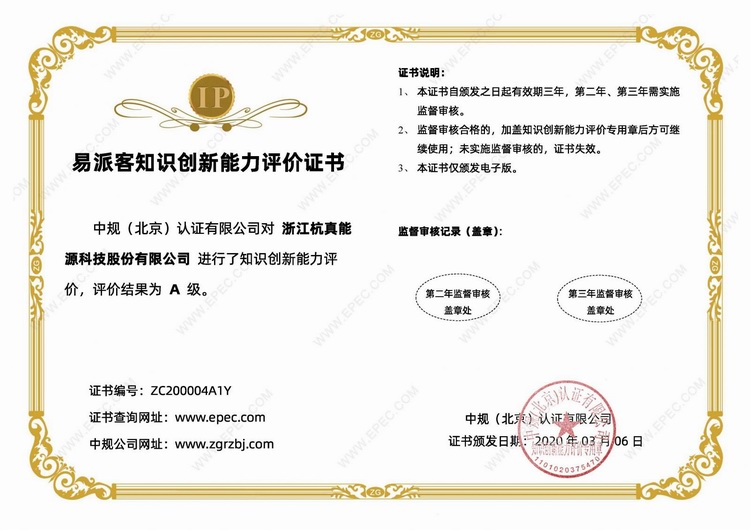 Hangzhen Energy obtained the "Epak Knowledge Innovation Capability Evaluation Certificate"On March 6, the company obtained the "Epak Knowledge Innovation Capability Evaluation Certificate" issued by China Standard (Beijing) Certification Co., Ltd., and the evaluation result was A-level.